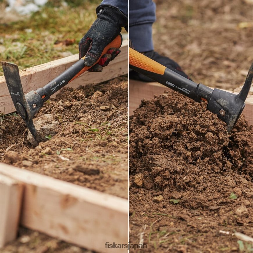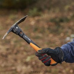 - ヘッドには、硬い表面を通り抜けるためのピックエンドと、硬い土壌で鍬として使用できるマトックエンドが備わっています