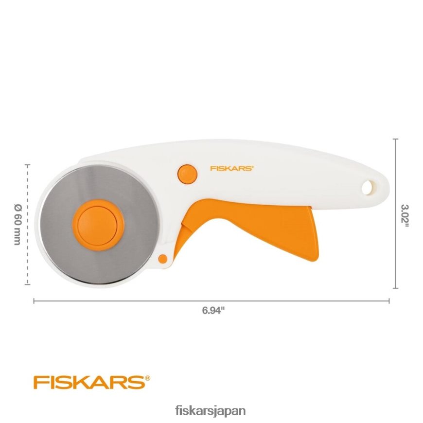 - フィスカルス トリガー ロータリー カッター 60 mm は、バッティング時のスムーズなカットに最適です。キャンバス、デニム、レザーなどの厚手の生地